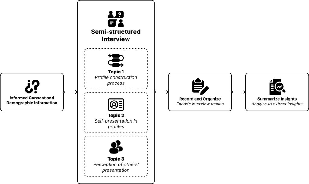 The semi-structured interviews were designed to cover three main topics: a step-by-step profile construction process to see how daters choose photos and text for their profiles, questions regarding self-presentation in profiles, and perception of others’ presentation.