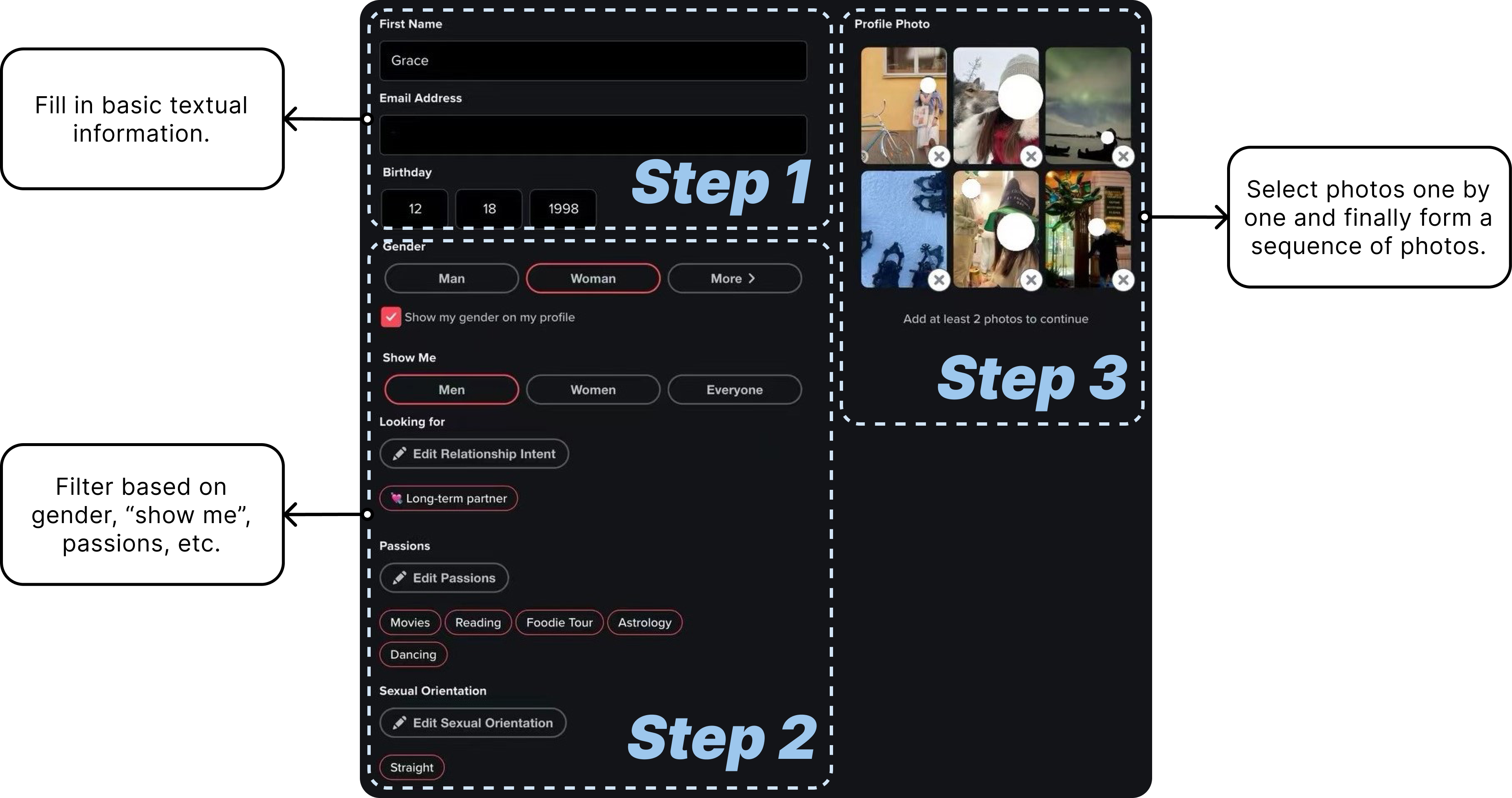 We asked participants to use the profile-making interface of Tinder to create a new profile step by step.